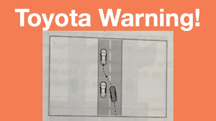 On page 181, Toyota notes that its cruise control feature can cause the car to change lanes, sway, swerve off the road . . .…