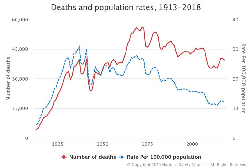 Despite these historic drops [since 1923], we cannot remain complacent. While motor-vehicle deaths and rates declined last year [2019], since 2013 deaths have increased 11.4% and the mileage death rate has increased 3.4%.